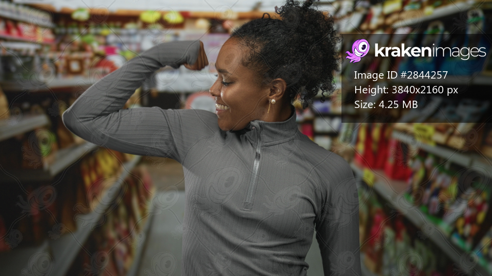 African american woman flexing biceps in supermarket aisle with stocked shelves; empowerment confidence health vitality.