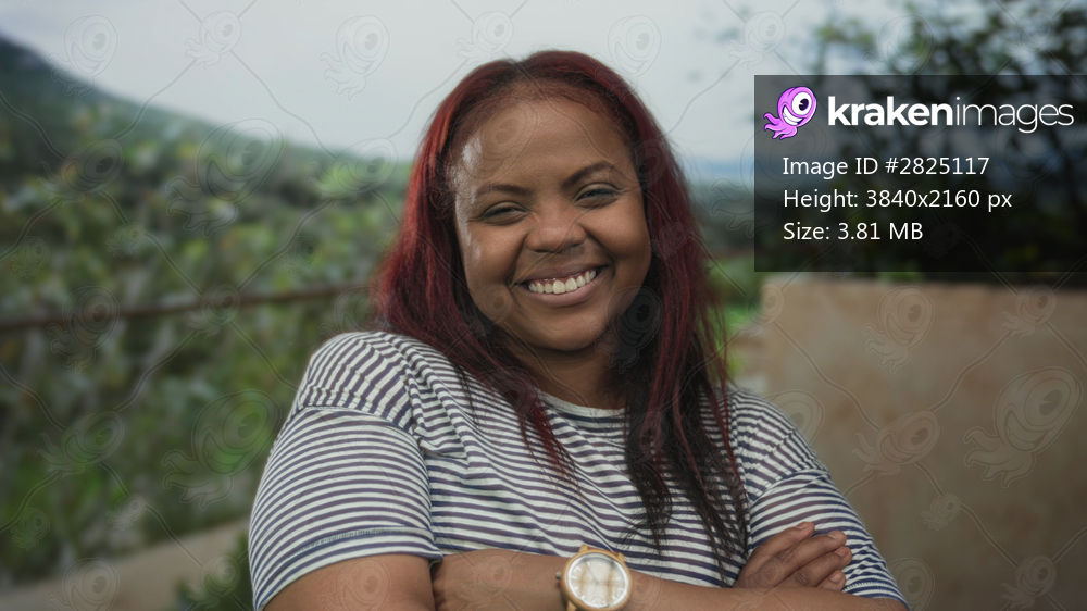 African american woman folding arms and smiling in sunlit green forest setting; confidence contentment.