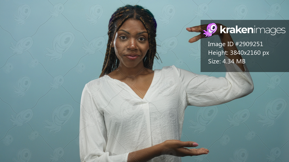 African american woman framing an invisible object with both hands in studio against light blue backdrop; confidence presentation.