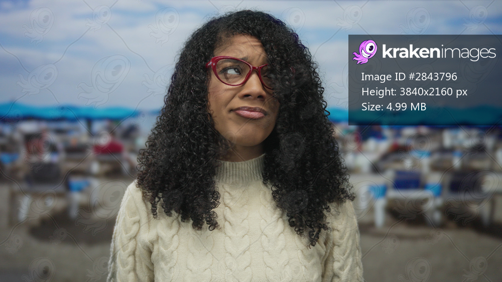 African american woman frowns wearing red eyeglasses and cable knit sweater on blue street; doubt concern.