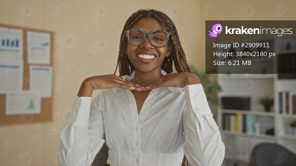African american woman with glasses and braided hair, hands under chin smiling while seated in an office with shelves and corkboards; confidence charm. - Kraken Images