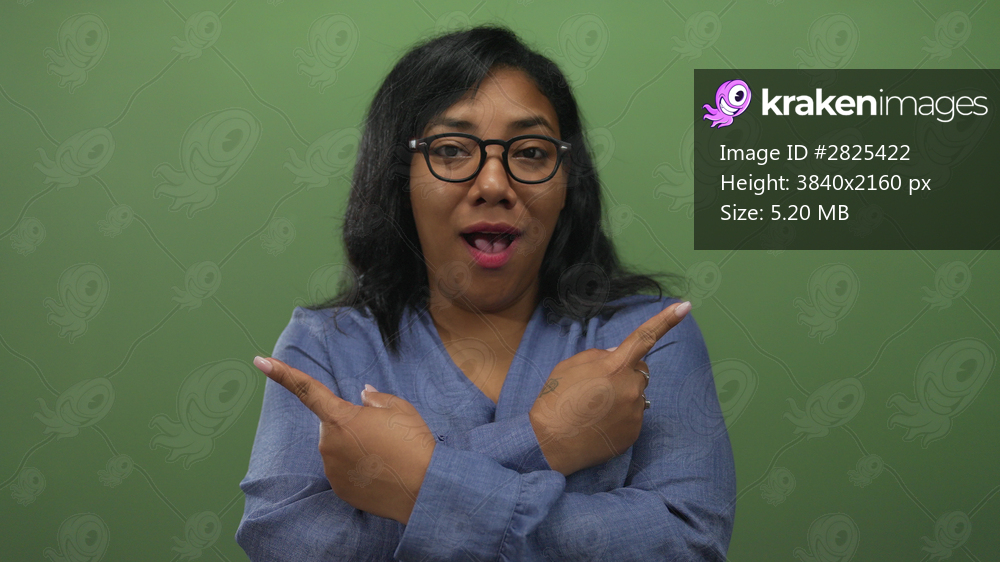 African american woman with glasses and open mouth points index fingers in studio; choice indecision.