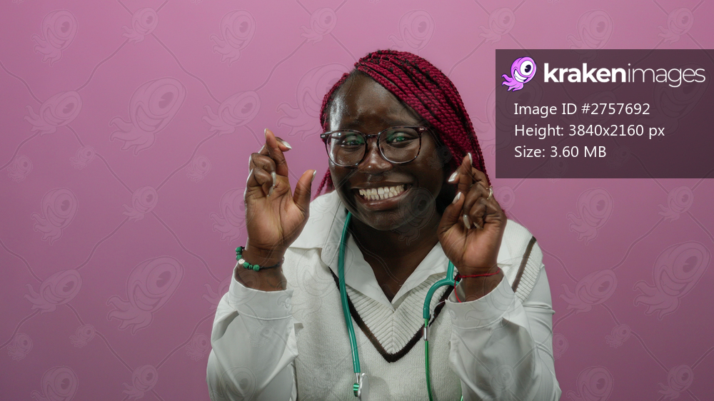 African american woman with glasses and stethoscope crossing fingers while smiling confidently against an isolated pink background wall.