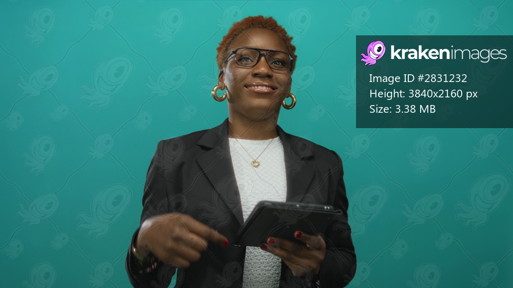 African american woman with glasses and tablet beckons with hand in studio; invitation welcome warmth connection.