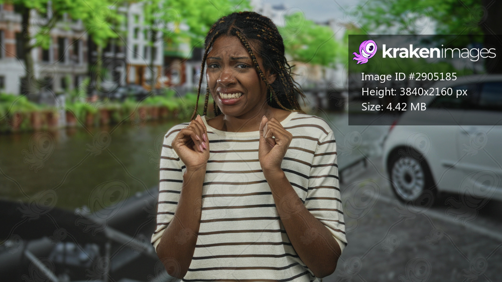 African american woman grimaces, fingers pinching her collar of a striped shirt on a canal street with parked car; disgust.