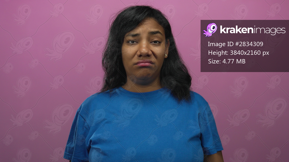African american woman grimaces in studio with purple backdrop wearing blue shirt and loose hair under soft lighting; disgust.