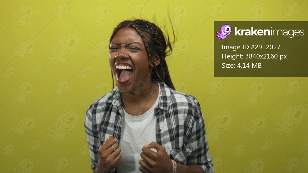 African american woman grinning with clenched fists and squinted eyes in studio against lime green backdrop; joy celebration.