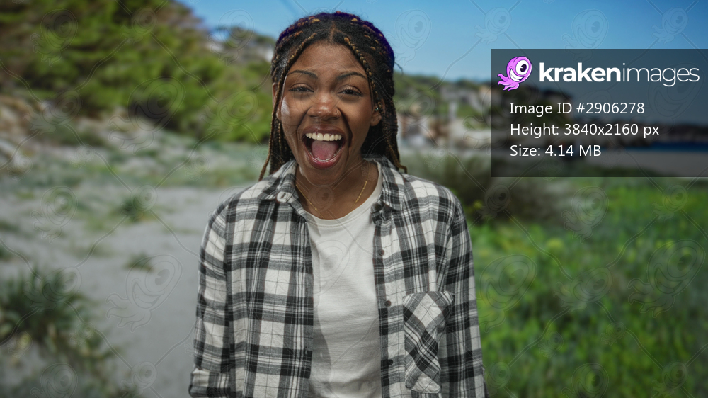African american woman with hand cupping mouth shouting and smiling broadly on studio set with beach backdrop; joy.