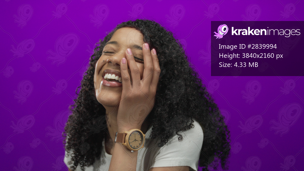 African american woman with hand on cheek laughing in purple studio wearing white t shirt; happiness joy delight amusement.