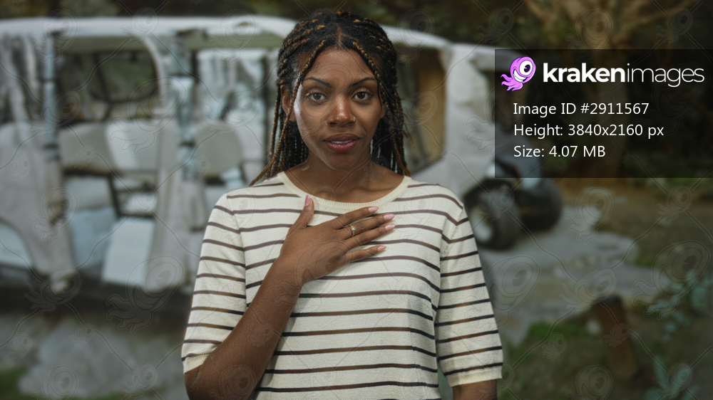 African american woman with hand on chest gesture in forest, striped shirt and ring visible; gratitude reflection.