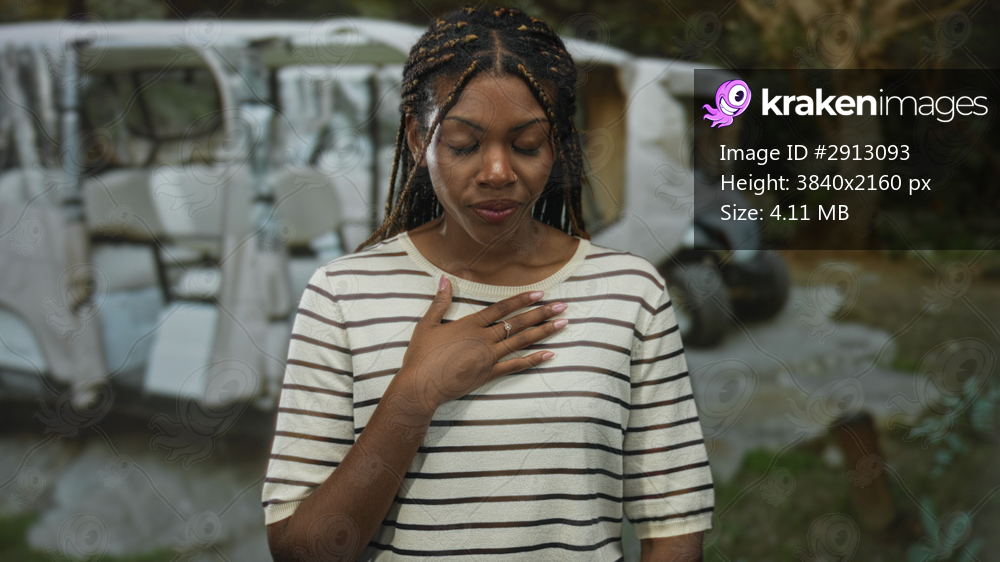 African american woman with hand on chest gesture in forest, striped shirt and ring visible; gratitude reflection.
