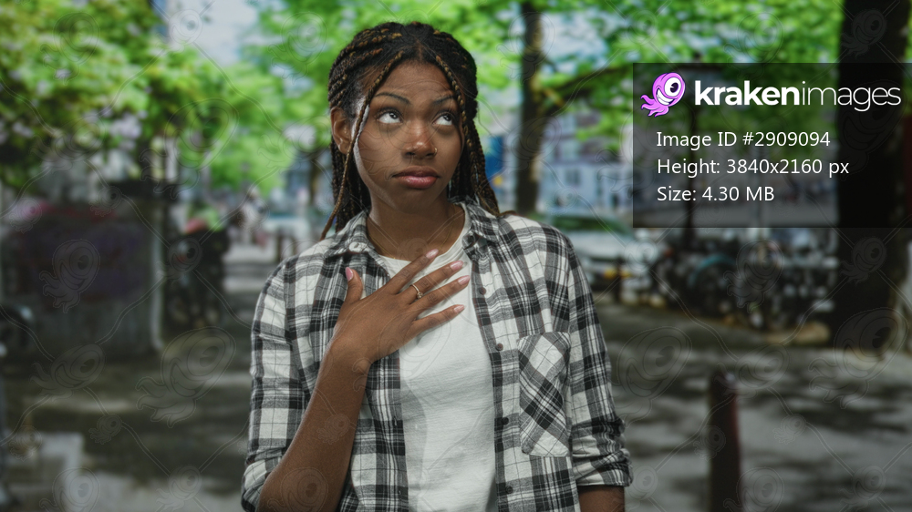African american woman with hand on chest on city street wearing plaid shirt and white t shirt; gratitude reflection.