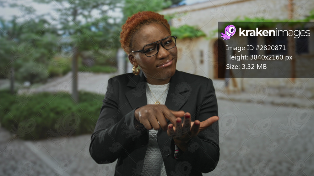 African american woman hands beckon gesture on old town cobblestone street by stone building facade; desperation plea.