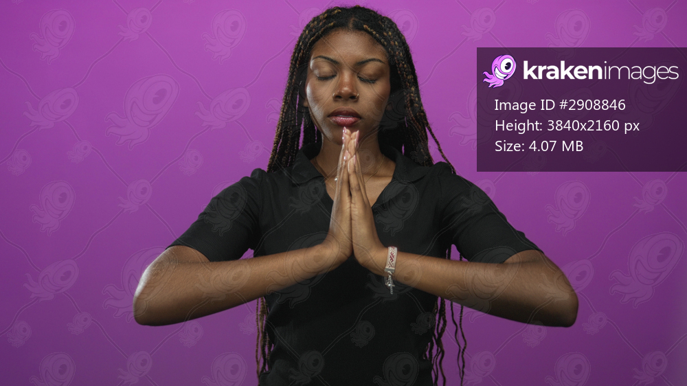 African american woman with hands pressed together praying gesture in studio purple; peaceful meditation serenity.