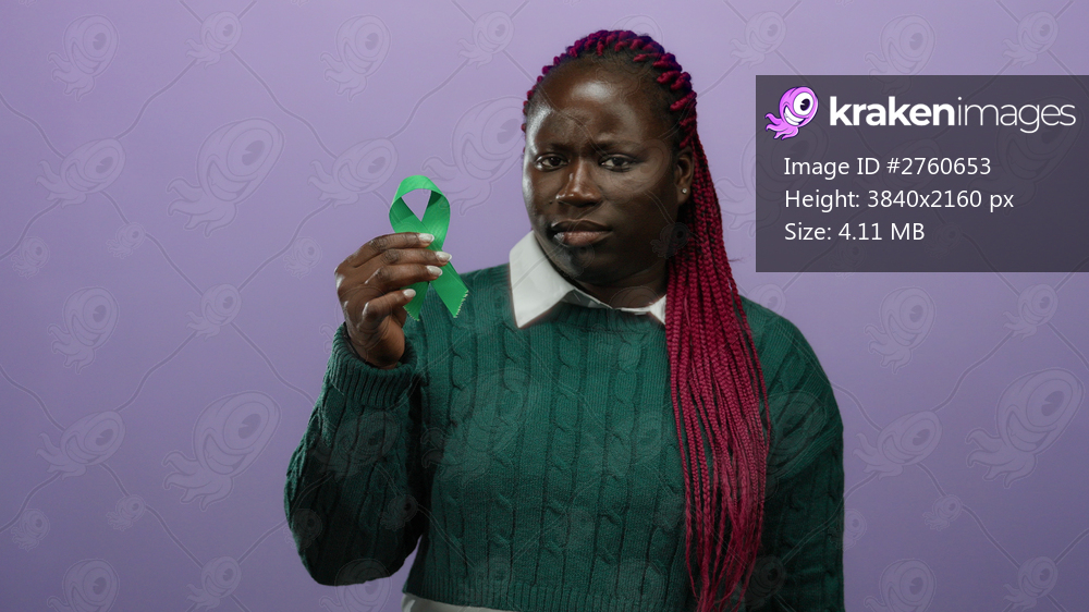 African american woman holding a green ribbon stands against an isolated purple background wall, showcasing awareness and diversity.