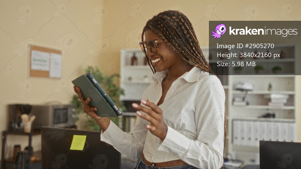 African american woman holding a tablet and smiling while standing at a desk in an office wearing glasses; confidence productivity.