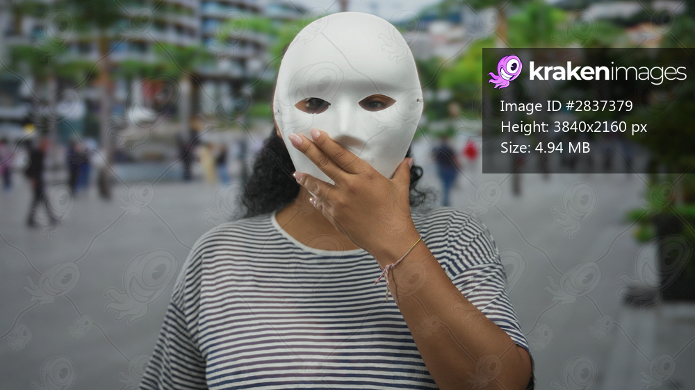 African american woman holding a white plaster mask to her face in a busy urban street with blurred passersby; mystery.