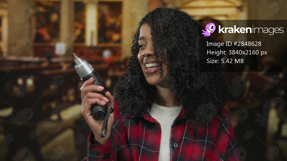 African american woman holding drill with right hand and smiling in church interior; confidence empowerment.