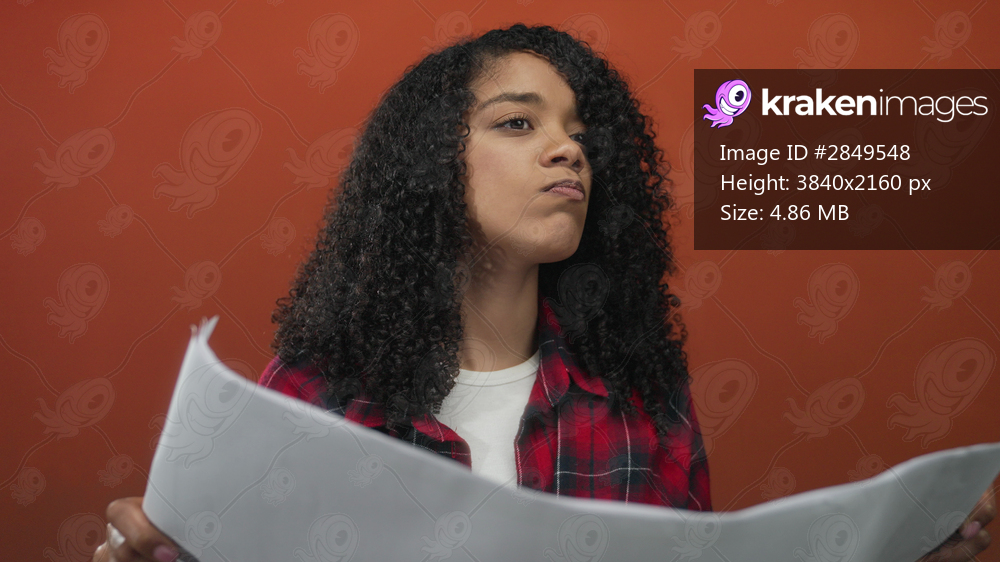 African american woman holding large rolled paper while gazing upward in studio; anticipation planning.
