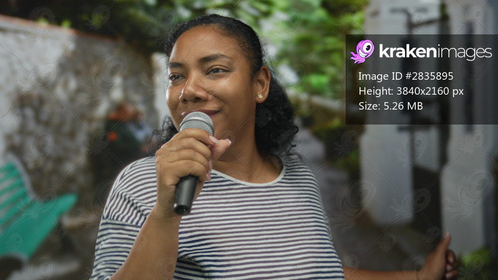 African american woman holding microphone near lips smiling and singing through golden sunlight on stone street patio; joy.