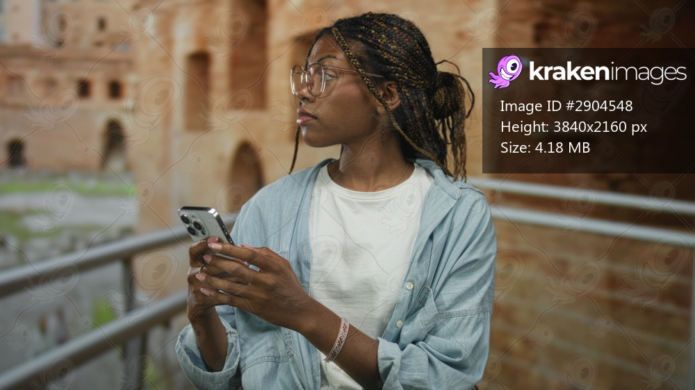 African american woman holding smartphone at roman ruins building, hands visible scrolling screen while glancing aside; contemplation curiosity.
