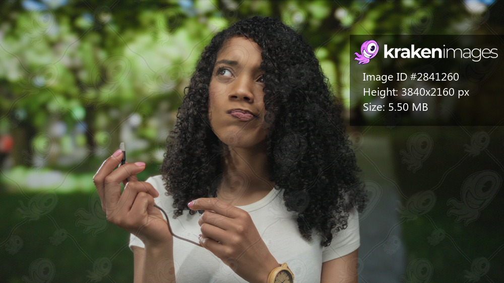 African american woman holds broken headphone cable connector and examines it in park; confusion frustration.