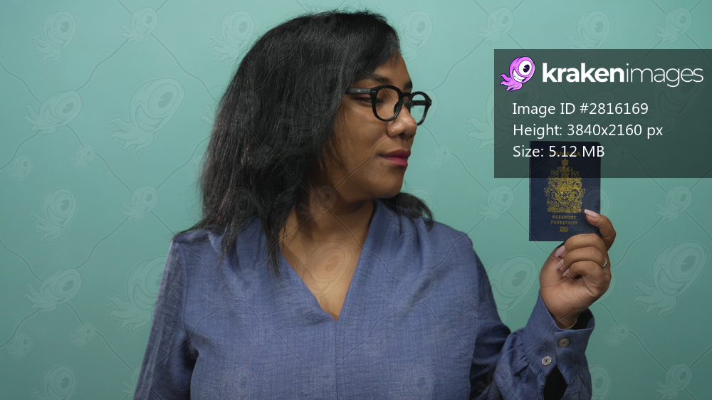 African american woman holds canadian passport in studio with teal backdrop; identity travel anticipation.