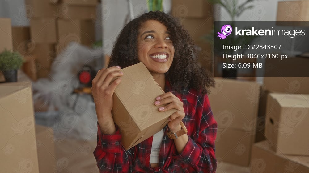 African american woman holds cardboard box close to chest while smiling in building; joy excitement anticipation.