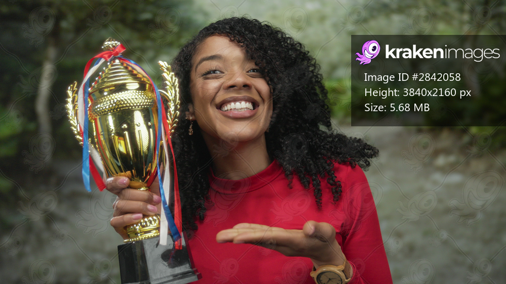 African american woman holds gold trophy and smiles in forest amid lush green foliage; victory joy achievement.