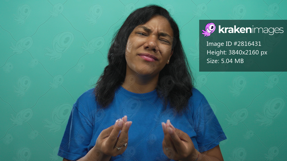 African american woman holds palms up and scrunches eyebrows against turquoise wall in a studio; confusion.