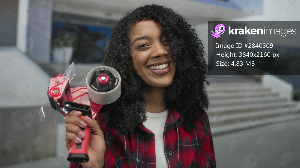 African american woman holds red packing tape dispenser on building steps with bright smile; joy.