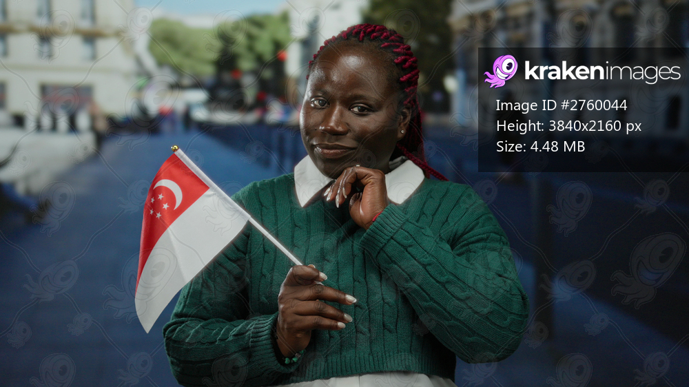 African american woman holds singapore flag on a city street outdoor, wearing a green sweater against an urban backdrop, showcasing cultural diversity and global unity. - Kraken Images