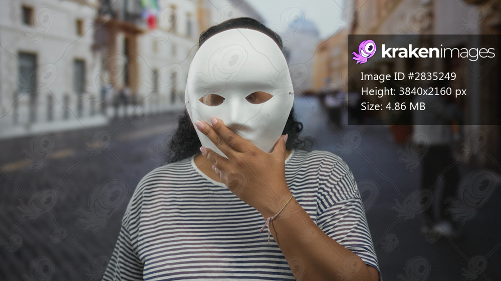 African american woman holds white mask to face with eyes closed on a sunlit city street; identity introspection secrecy transformation.