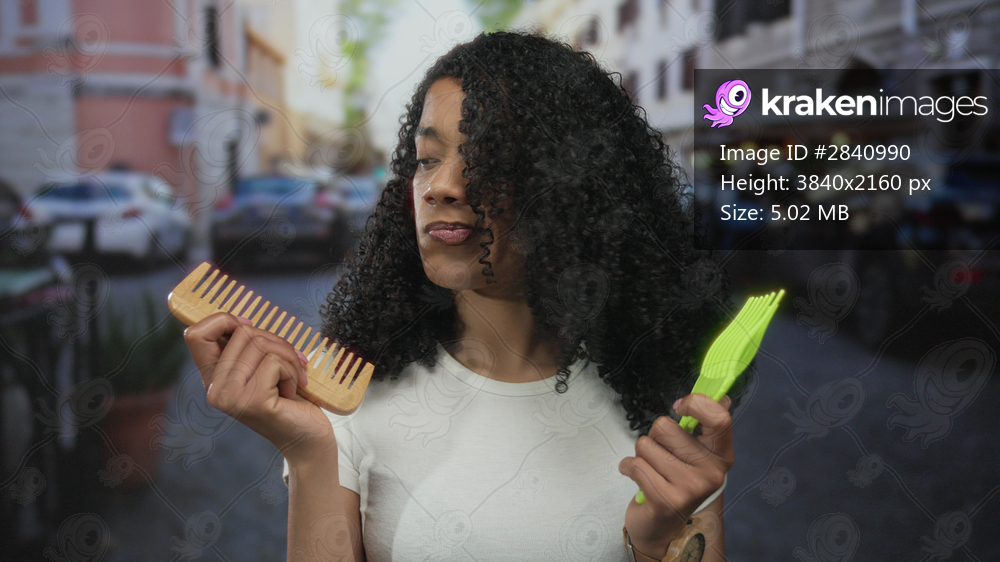 African american woman holds wooden comb and green pick as she compares hair tools on bustling street; indecision.