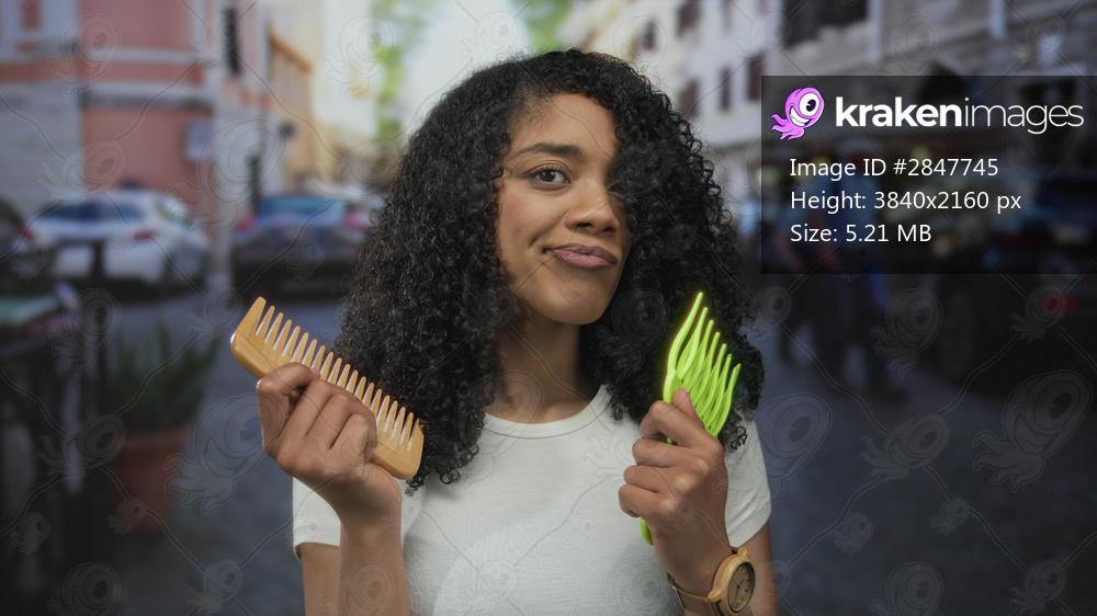African american woman holds wooden comb and green pick as she compares hair tools on bustling street; indecision.