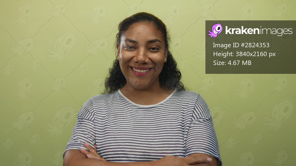 African american woman in a striped shirt smiling with arms crossed against green studio wall; confidence.