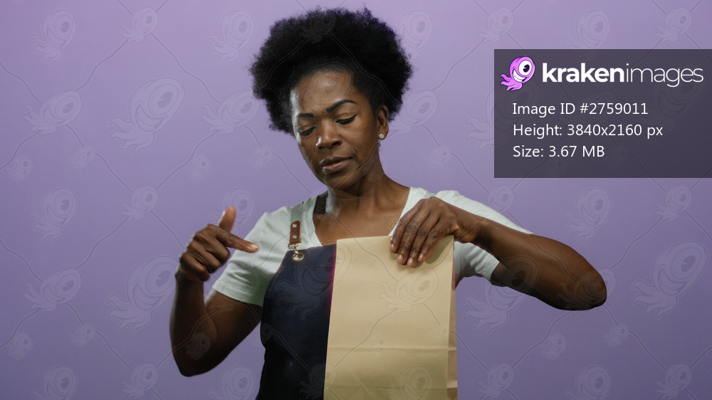 African american woman in apron holding paper bag for takeout against isolated purple background, symbolizing youthful waitress and service industry.