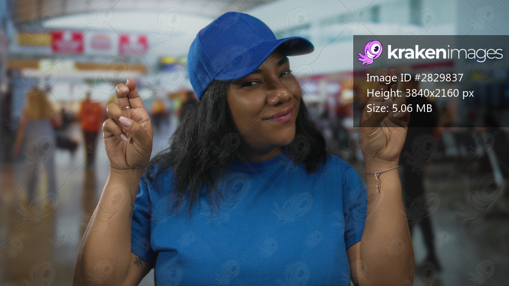 African american woman in blue cap and shirt makes air quotes amid busy passengers in airport terminal; sarcasm.