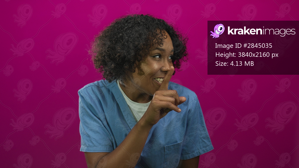 African american woman in blue scrub top pressing finger to lips for silence in studio; quiet secrecy.