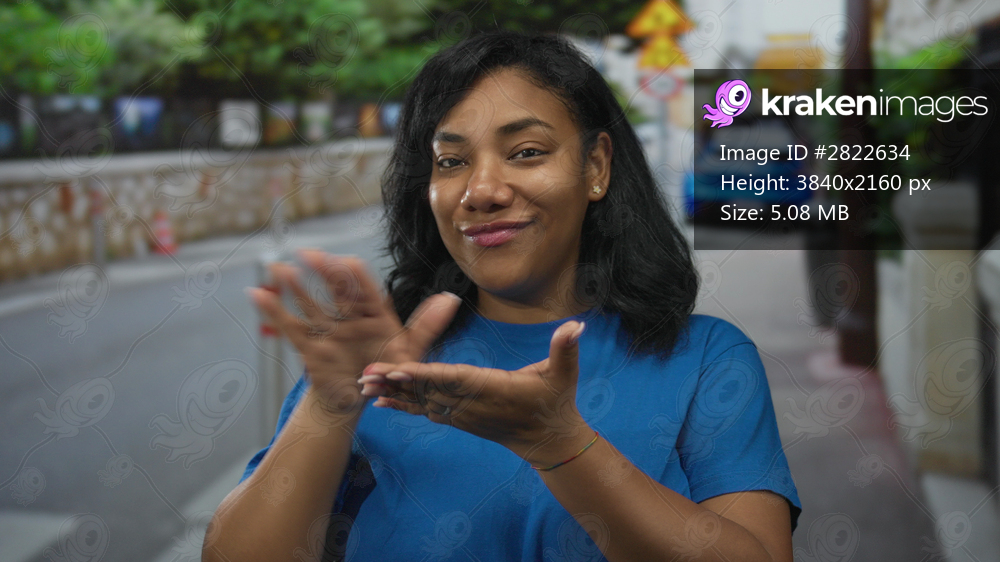 African american woman in blue shirt smiles while making money spending gesture on street; generosity.