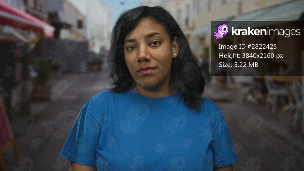African american woman in blue shirt standing on street with visible face looking at camera; melancholy.