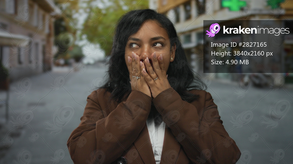 African american woman in brown blazer holds hands to cheeks on street lined with shops and cobblestones; surprise joy.