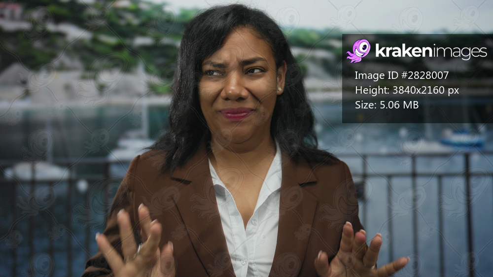 African american woman in brown blazer raises hands in pushaway gesture at seaside port; denial refusal caution warning.