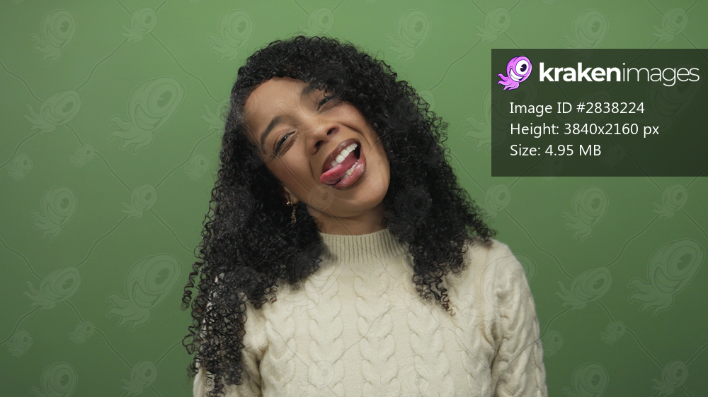 African american woman in cream cable knit sweater sticks her tongue out and squints eyes in studio; playfulness.