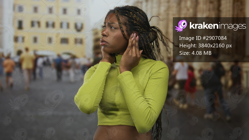 African american woman in green crop top with hands to ear on old town street by historic building; discomfort.