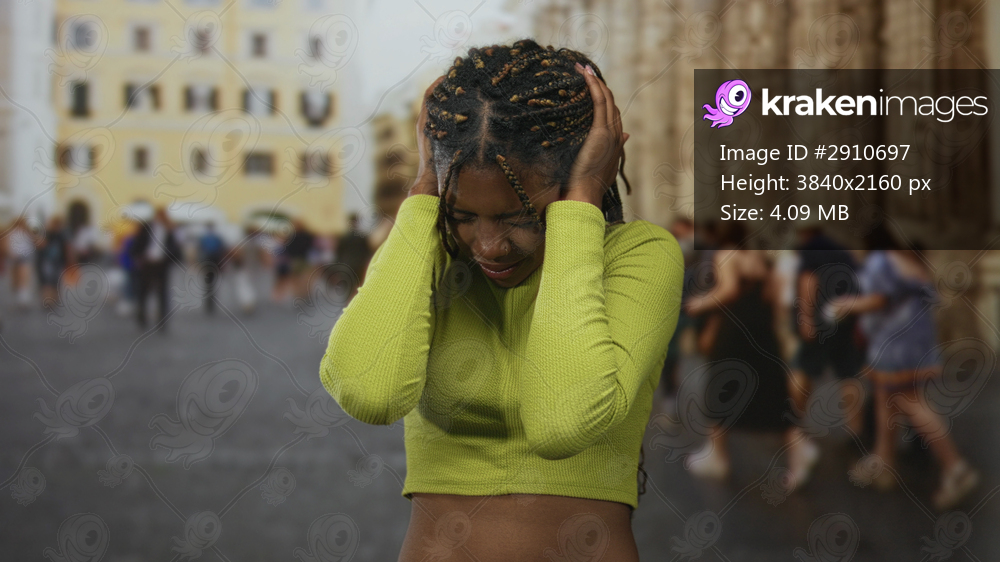 African american woman in green crop top with hands to ear on old town street by historic building; discomfort.