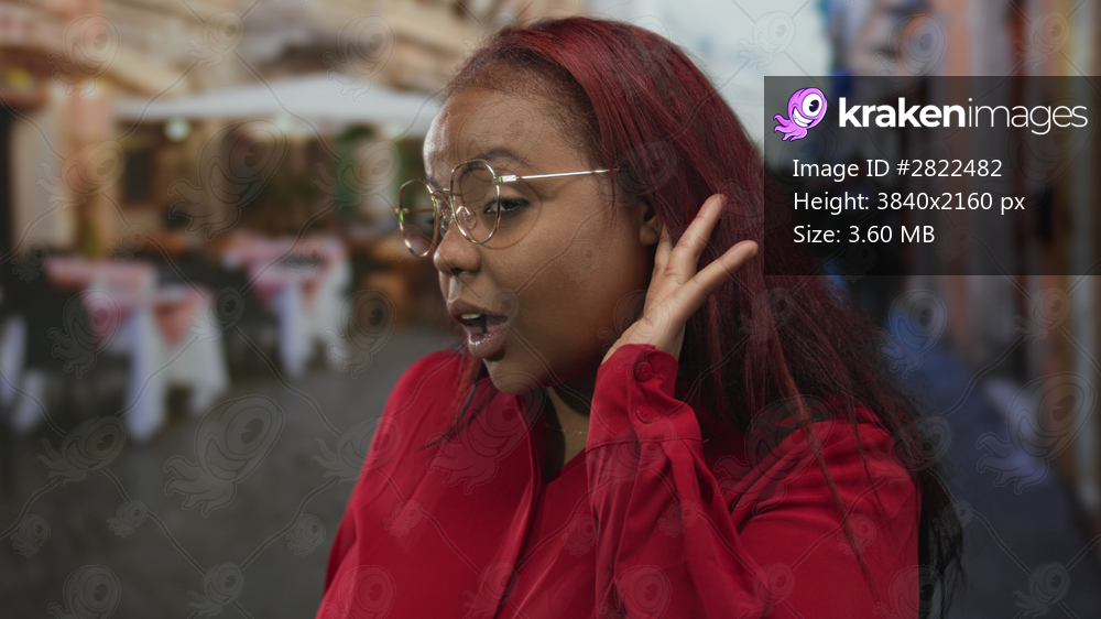 African american woman in red blouse smiling holds hand to ear on street outside restaurant; curiosity.