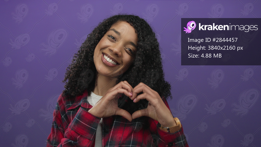 African american woman in red plaid shirt smiling forms heart gesture in purple studio; love warmth.