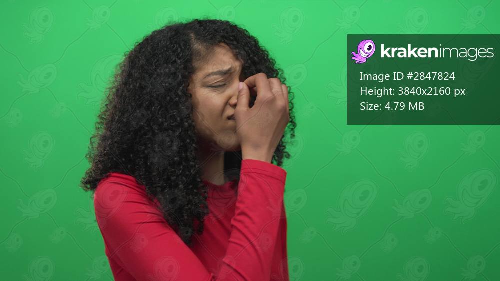 African american woman in red shirt with curly hair pinches nose and closes eyes in studio; disgust reaction.