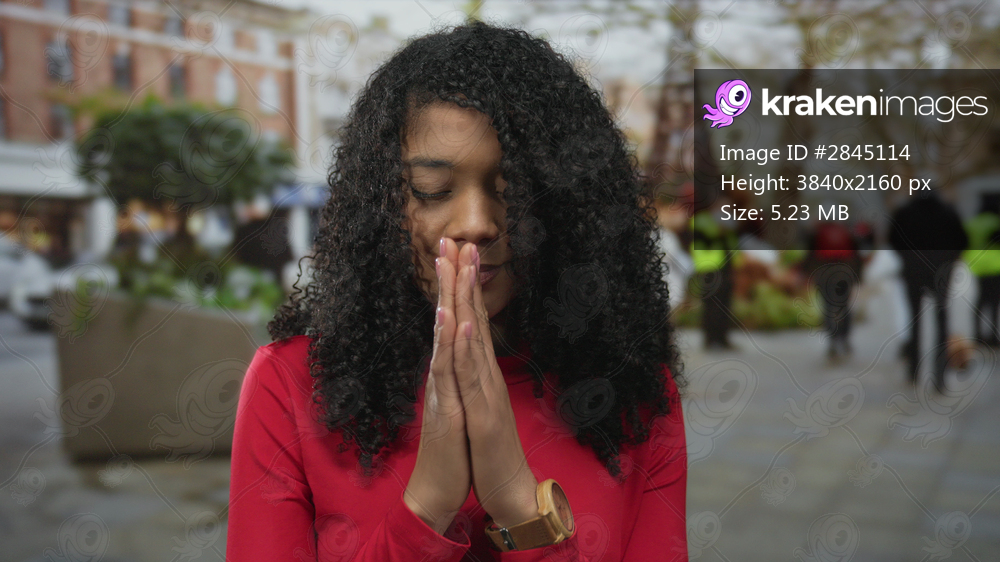 African american woman in red shirt presses palms together on busy urban street; hopeful reflection.